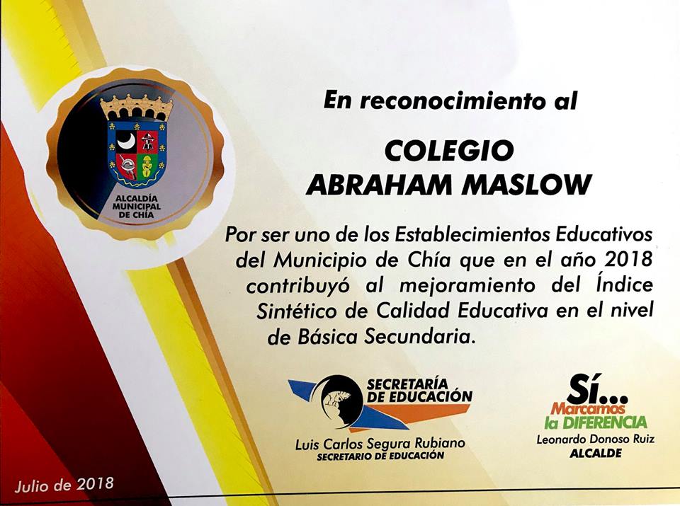 Compartimos con alegría que ayer, el Colegio Abraham Maslow fue doblemente premiado, con Reconocimiento por su alto nivel académico y por ser el mejor colegio en Ambiente y Convivencia Escolar. Premiación otorgada por Secretaría de Educación y la Alcaldía de Chía.